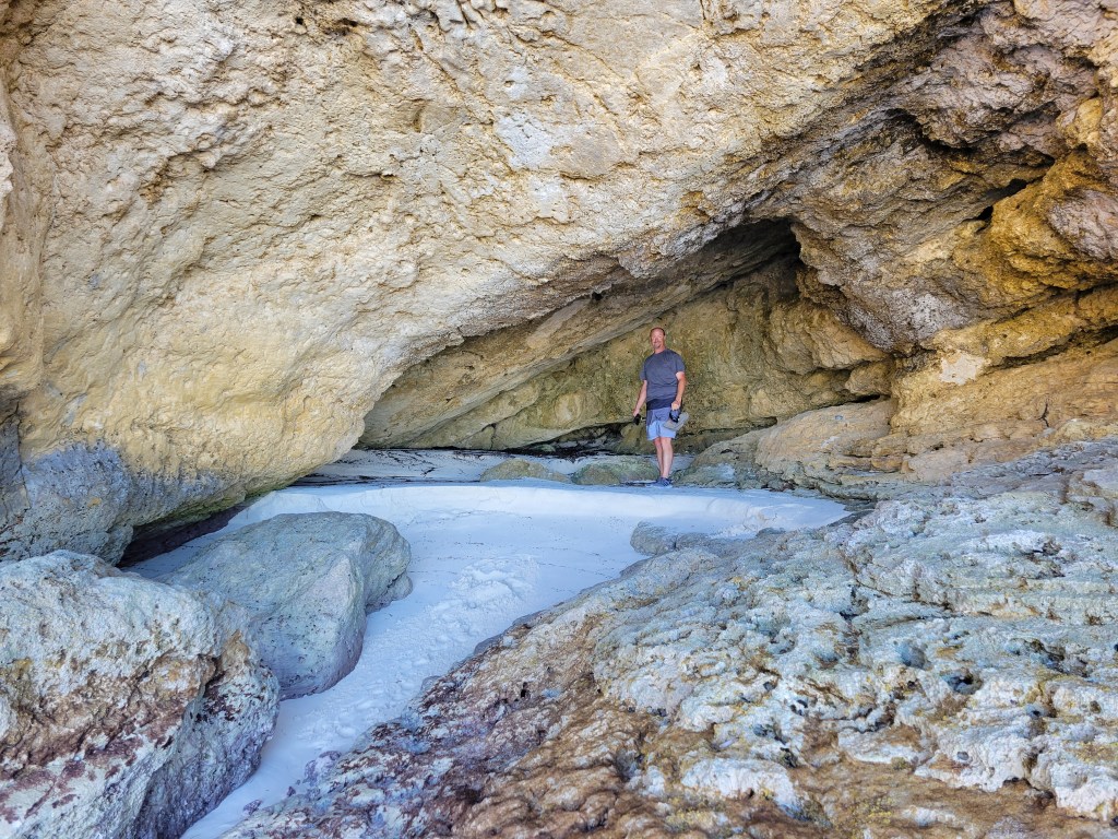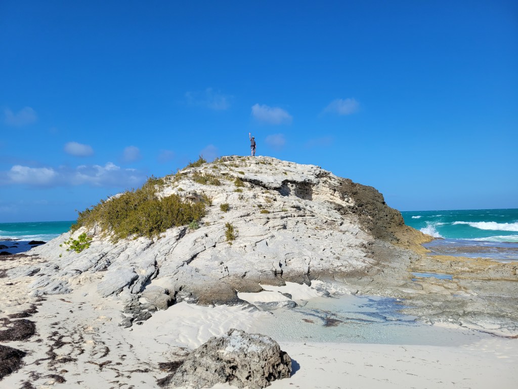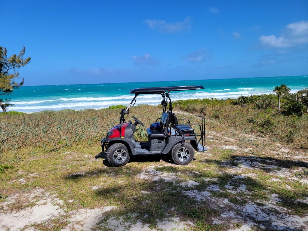 Next up, get back on your golf cart and continue back toward town. At the beach access point that’s on the map the marina gave you but there is no signage, turn left on to a dirt path. Those are the caves on the island. We spent a little time there watching the tall waves crashing onto the shore there. It was so windy that day!