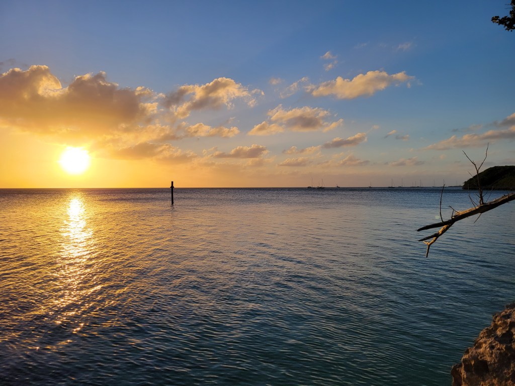 Normal people would probably explore one section of the island at a time, but, well, we’re us. We were getting hungry, and the sun was about 40 minutes from setting. We decided to go to the west side of the island to watch the sunset. We headed over to Bullock’s Harbour and to Cooliemae’s. The “closed” sign was in the window, but there were people sitting outside the building watching the sun go down. We decided we were going to just watch the sunset and leave, but the people there assured us the place was open. However, they said the restaurant usually only serves people who call ahead. So, we went inside and asked if we could be served. The server went back into the kitchen and asked. A minute later, she came back and said we could order. I asked for a menu, and the server said they didn’t have one. So she told us what they had. A customer came in while we were ordering and suggested the smothered fish. Owen ordered that, and I ordered the shrimp. We sat outside and waited for our food. We learned that the restaurant does not serve alcohol, but they will provide glasses if you bring your own. A group of locals had done just that, and they enjoyed bottles of wine together as the sun made its way toward the horizon.