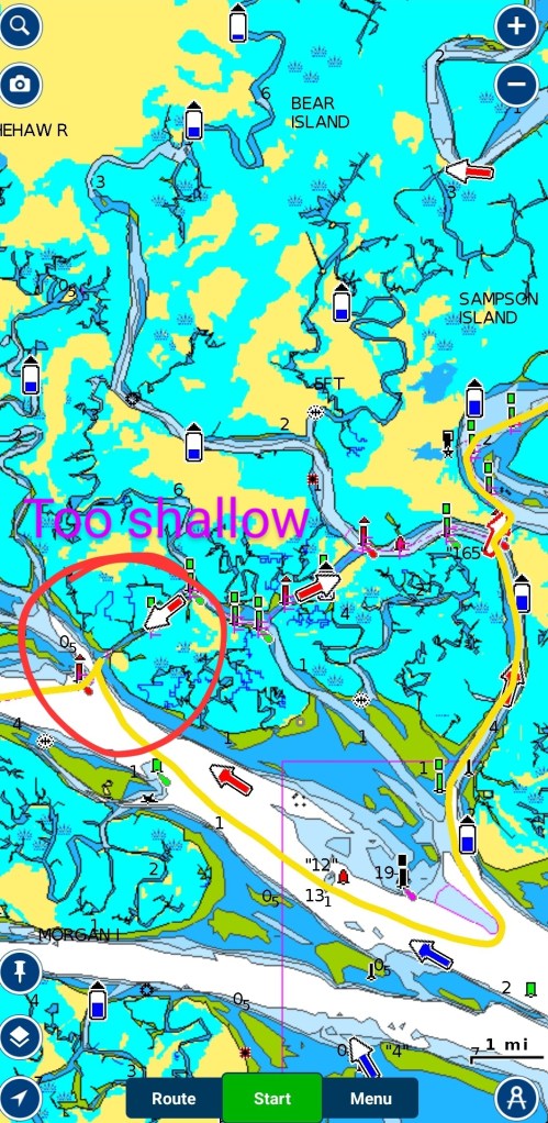 Our problem was that by this time, we were at low tide, and the already skinny channel we were to use was now even skinnier. After we crossed the Coosaw River and were prepared to enter the ICW channel, the depth finders found no depth and warned us. We quickly went from 6′ to 2.8′ (!!!!!!!!!). We know that we have an additional 2′ more than what our depth finder says we do, but 2.8′ is cutting it a little too close.