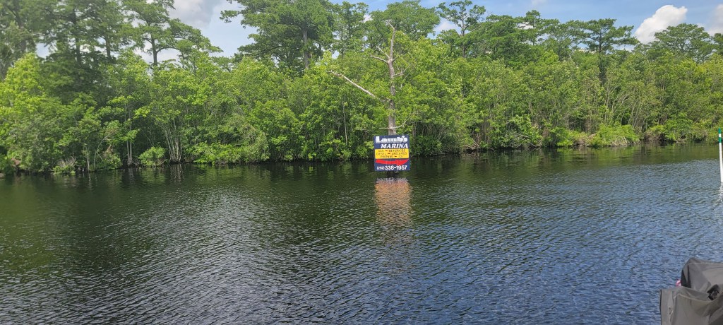 Our marina was right after the railroad bridge, and it, too, had a narrow opening. We made it inside, and a dock hand was waiting for us. What a protected marina! They don’t seem to have room for a lot of transients, but they had room for us. Everyone we encountered was kind and welcoming. There’s a laundry room ($1.50 to wash, $1.25 to dry) and bath house with three toilet/shower rooms, an on-site convenience store, and a Dollar General across the street. There is also a restaurant across the street, but we didn’t have an opportunity to eat there.