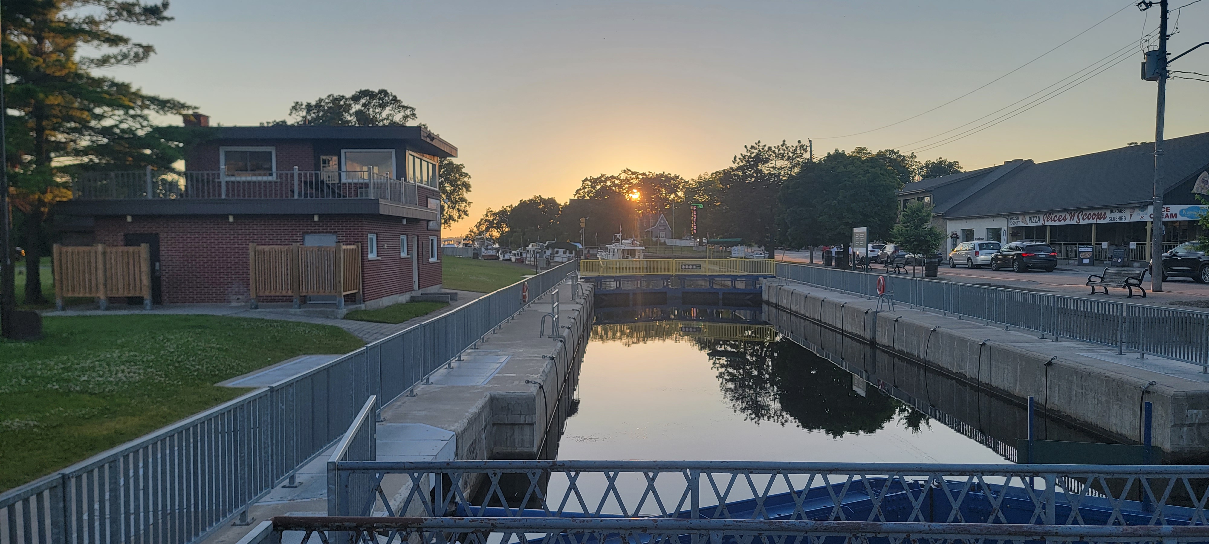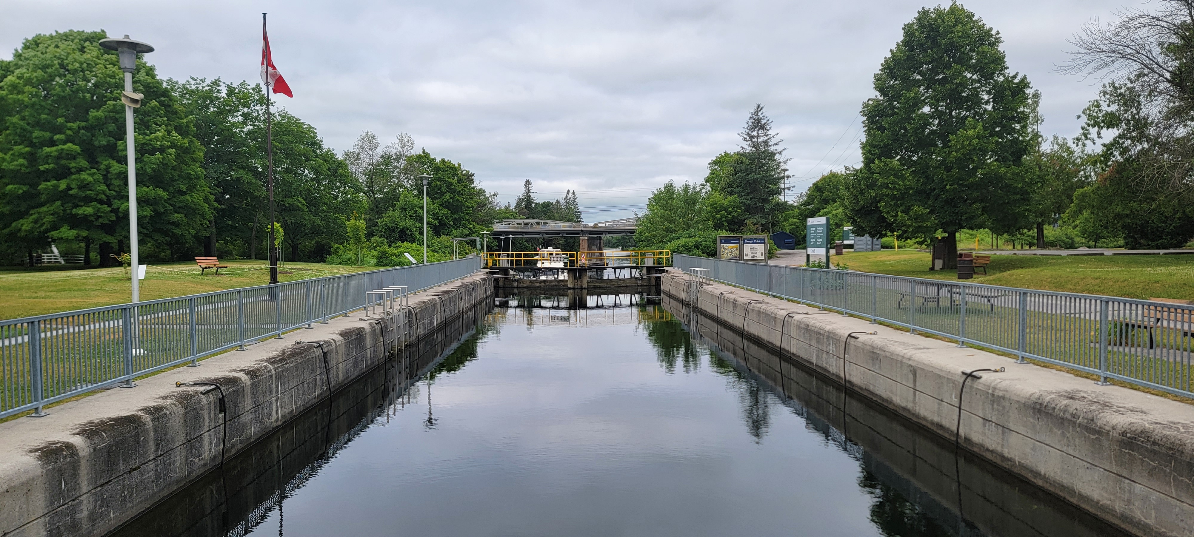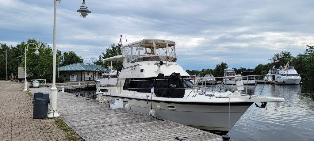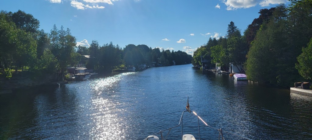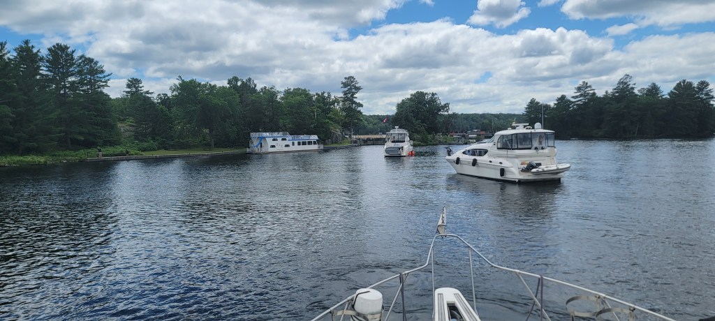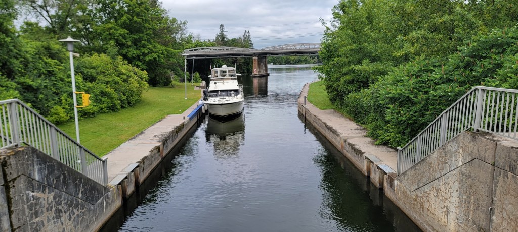 Bobcaygeon is the busiest lock on the system and in the heart of cottage country. It was very busy, but we did not have to wait long. Once we cleared the lock, we knew for certain that we could not make the next one in time. Lock 33 – Fenelon Falls – was 15 miles away. I called ahead to see if there was room on the grey line. The Lock Masters can’t reserve space for you, but they can tell you what is there at the time you call. The line was empty except for a couple of local cottagers who were sure to leave after dinner time.