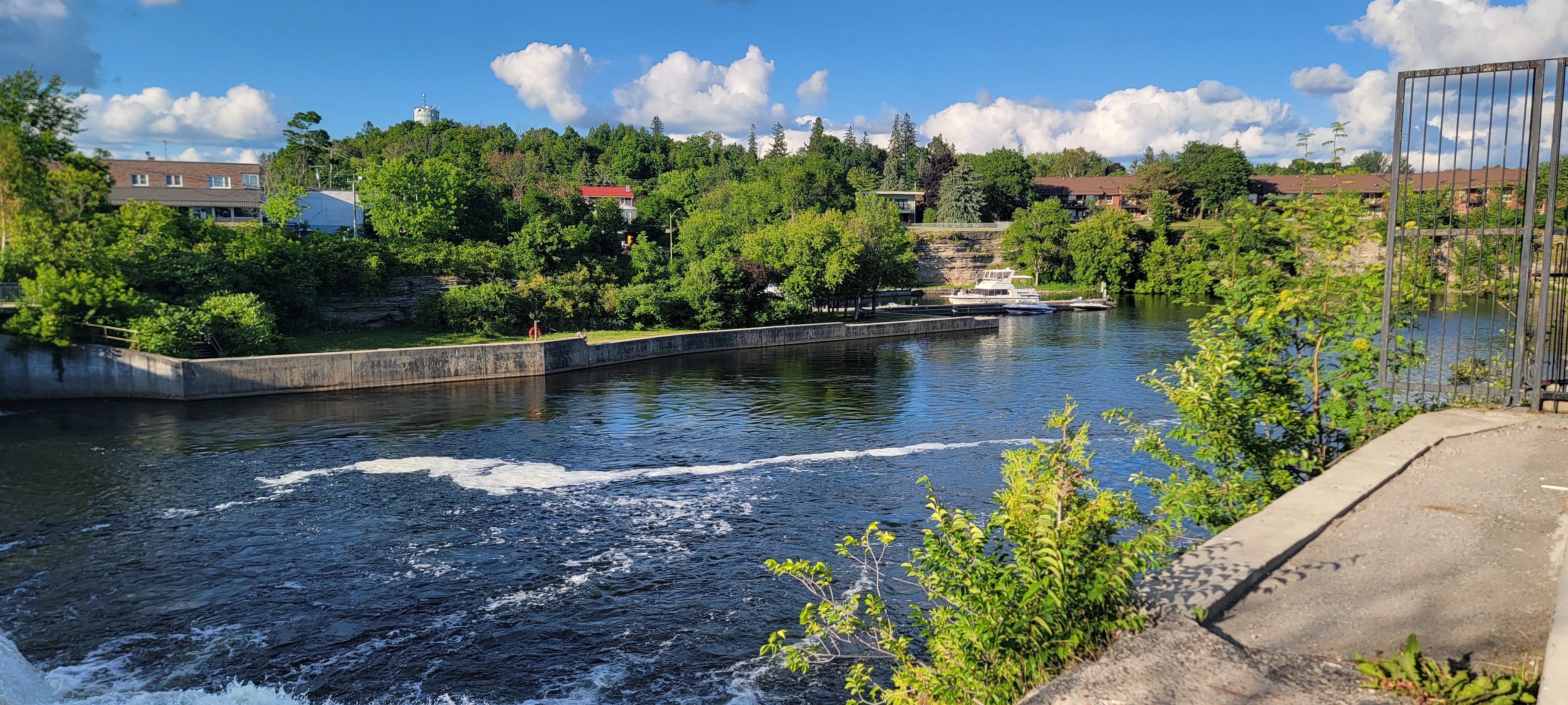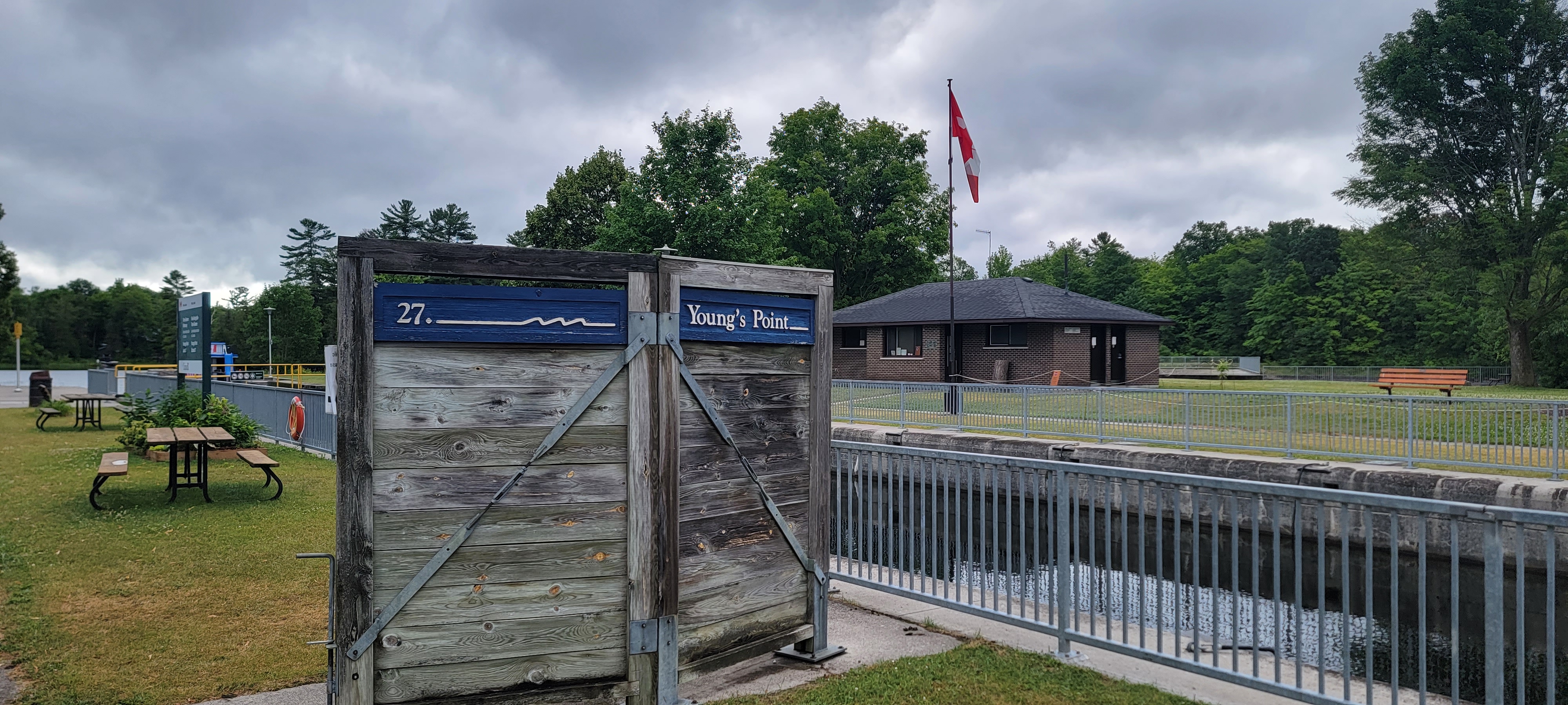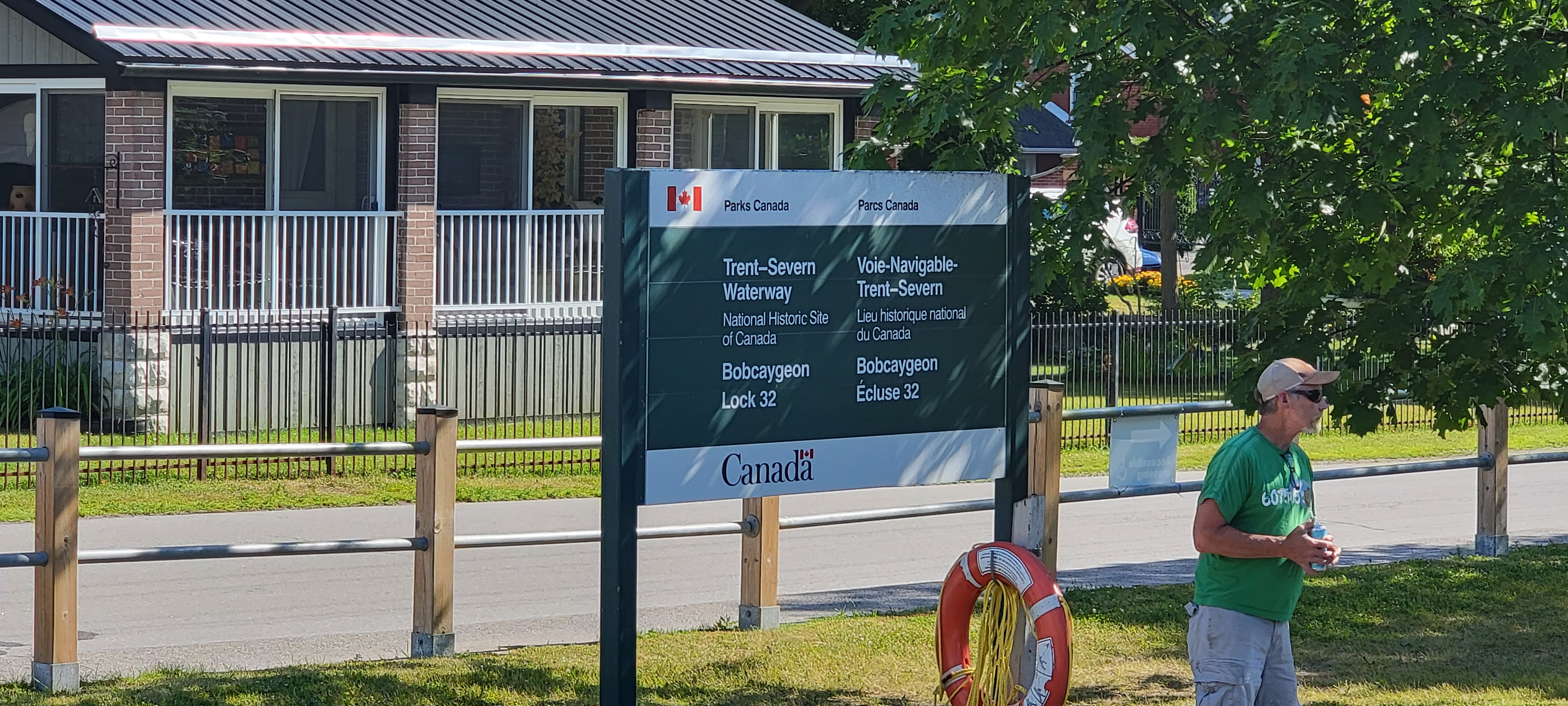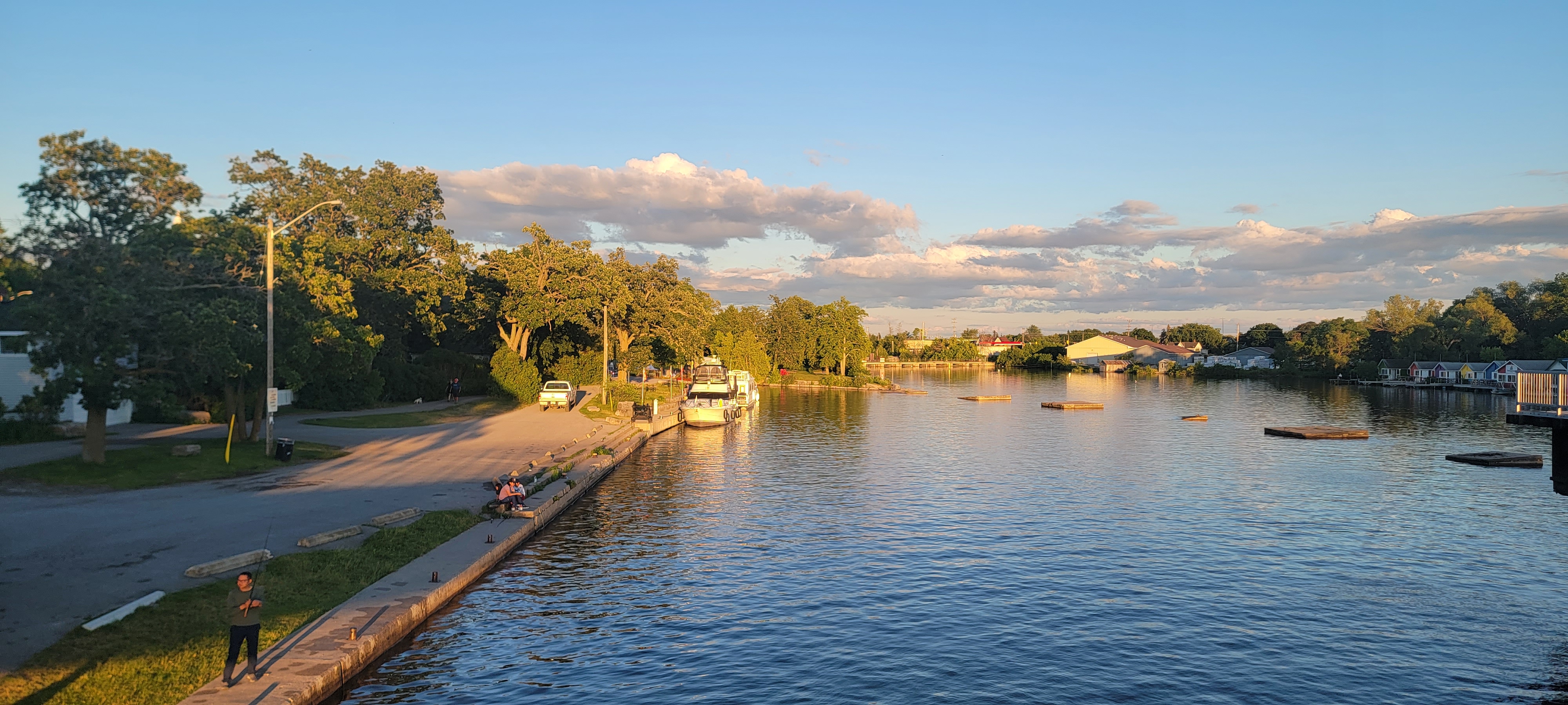 Bobcaygeon is the busiest lock on the system and in the heart of cottage country. It was very busy, but we did not have to wait long. Once we cleared the lock, we knew for certain that we could not make the next one in time. Lock 33 – Fenelon Falls – was 15 miles away. I called ahead to see if there was room on the grey line. The Lock Masters can’t reserve space for you, but they can tell you what is there at the time you call. The line was empty except for a couple of local cottagers who were sure to leave after dinner time.