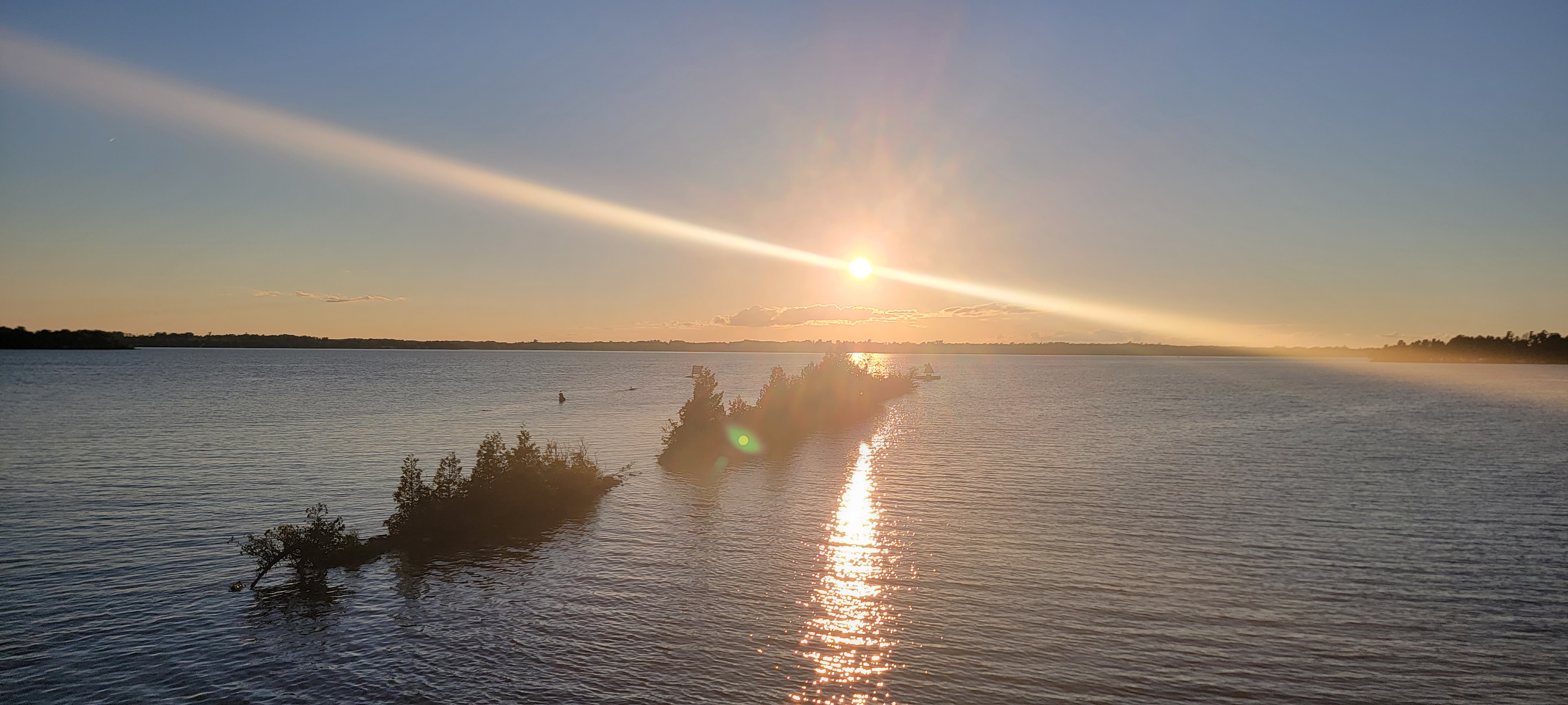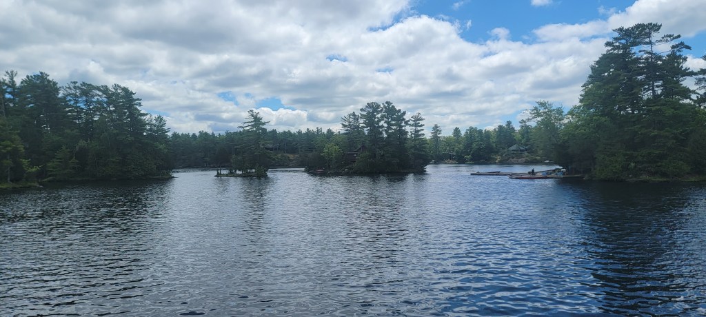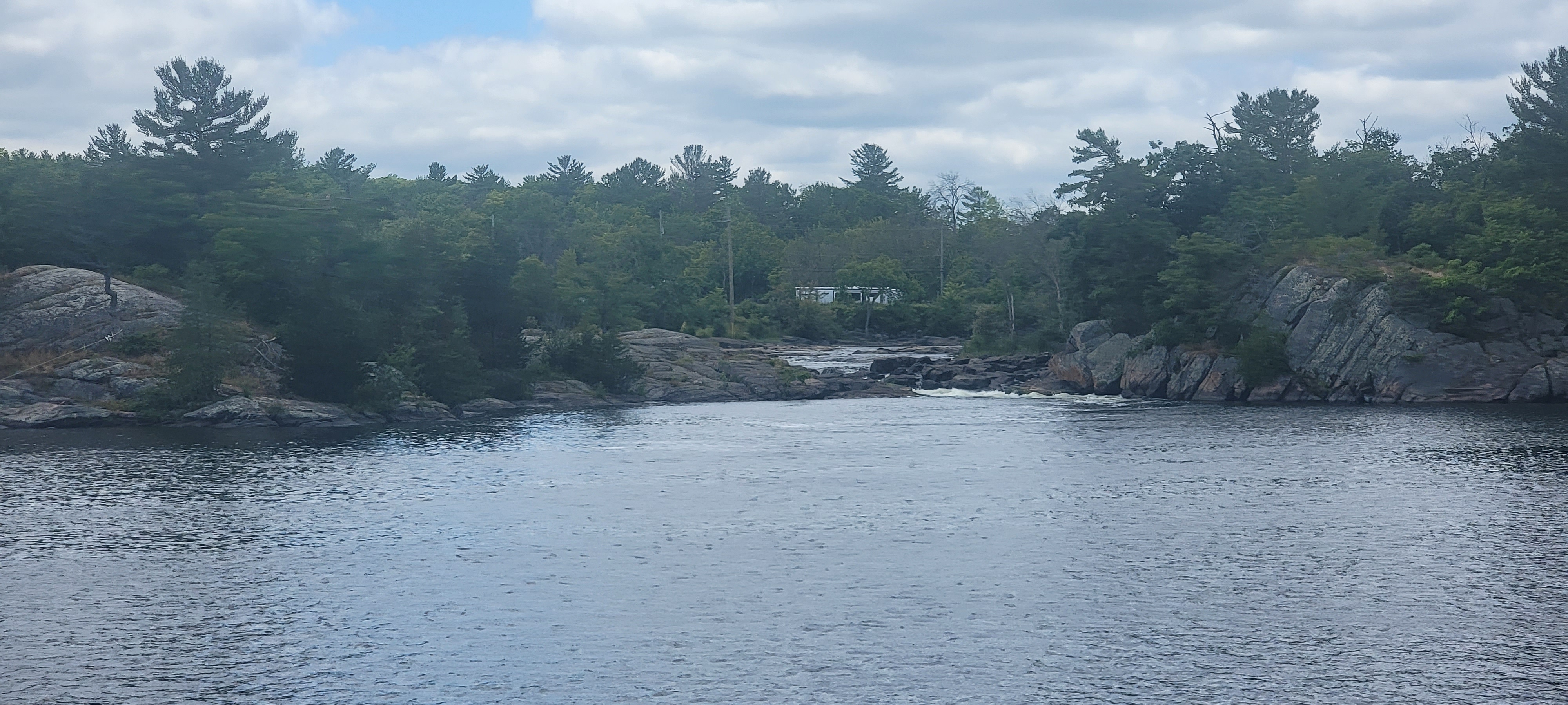 After work, we threw off the bowlines again to see how far we could get with the day that was left. That turned out to be 48 miles and some of the prettiest and coolest scenery on the Loop so far. We passed through Clear Lake at some speed to get a good start. Right after Clear Lake, we entered Stony Lake. That lake lived up to its name. Stony Lake is dotted with boulders and tiny granite islands. Perched on some of these islands were little cottages. Through all of this winds a narrow channel. It is plenty deep, but requires a captain to stay alert.