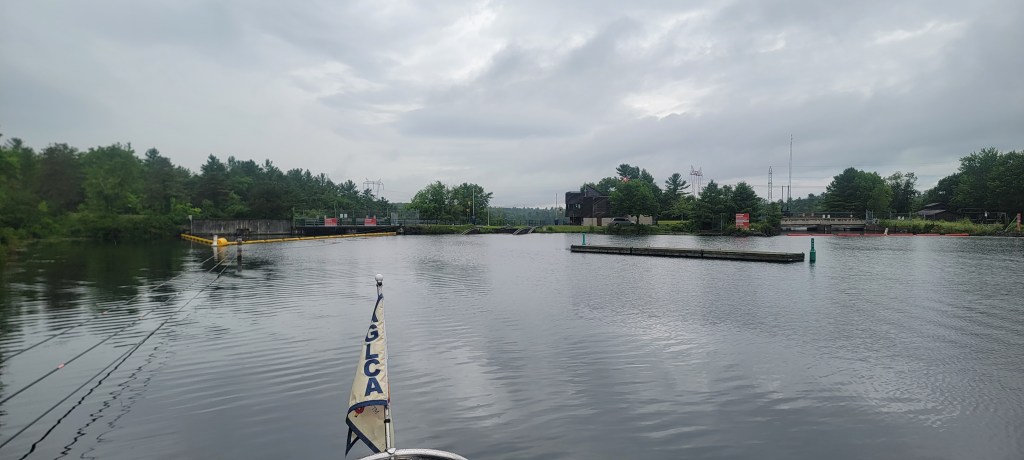 By this time, a friendly green-shirted lock operator came over to look at the boats and talk to us. He needed to check the boat behind us to verify dimensions. That boat was from Quebec and wasn’t a Looper. The operator told us that they would probably take us all one at a time from then on because of our sizes. Over the loud speakers, another operator told us to all move forward on the blue line as boats left to make room for other boats waiting. This began the process of all of us helping each other by grabbing lines and walking boats forward. Thankfully, we only had to do this a couple of times before it was our turn!