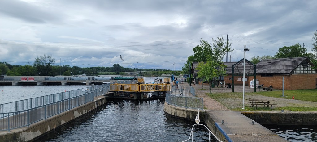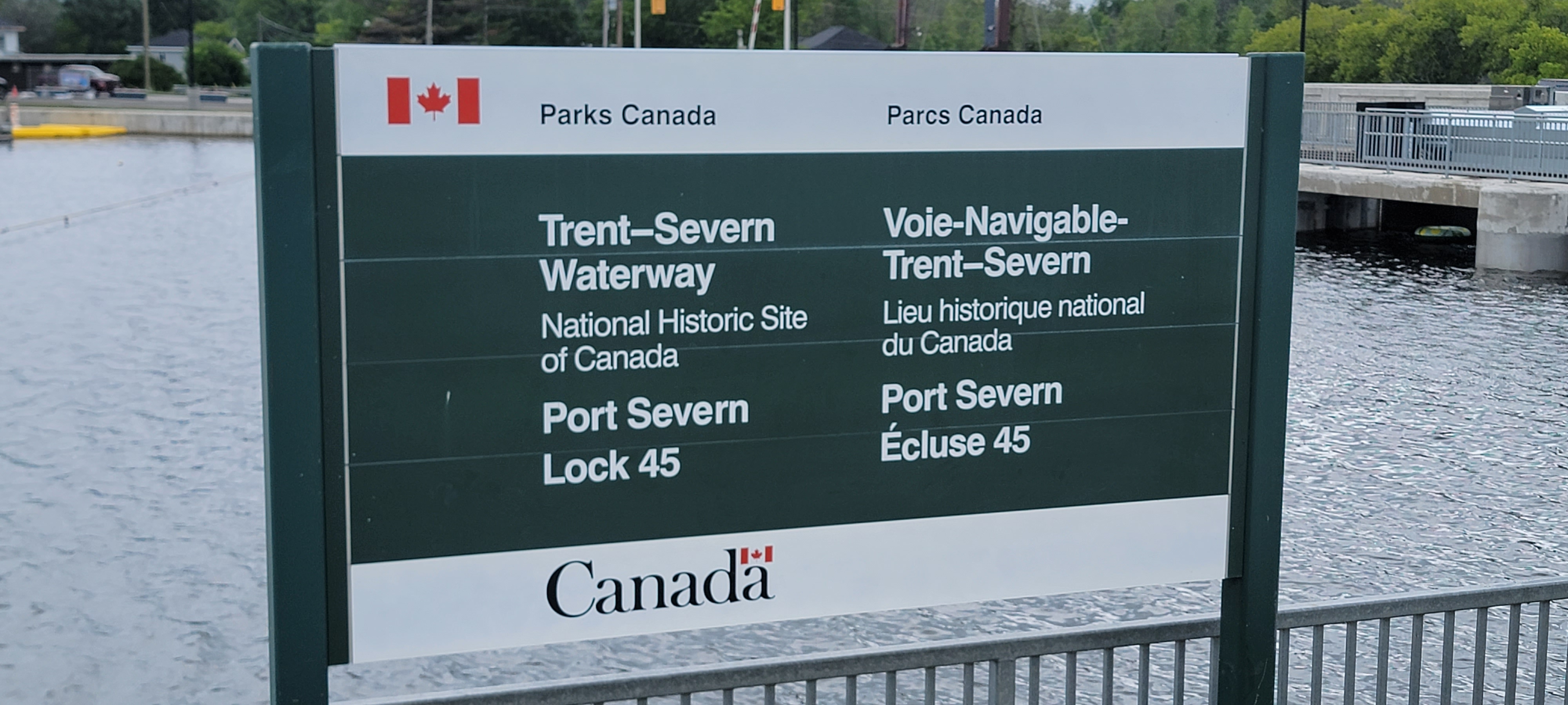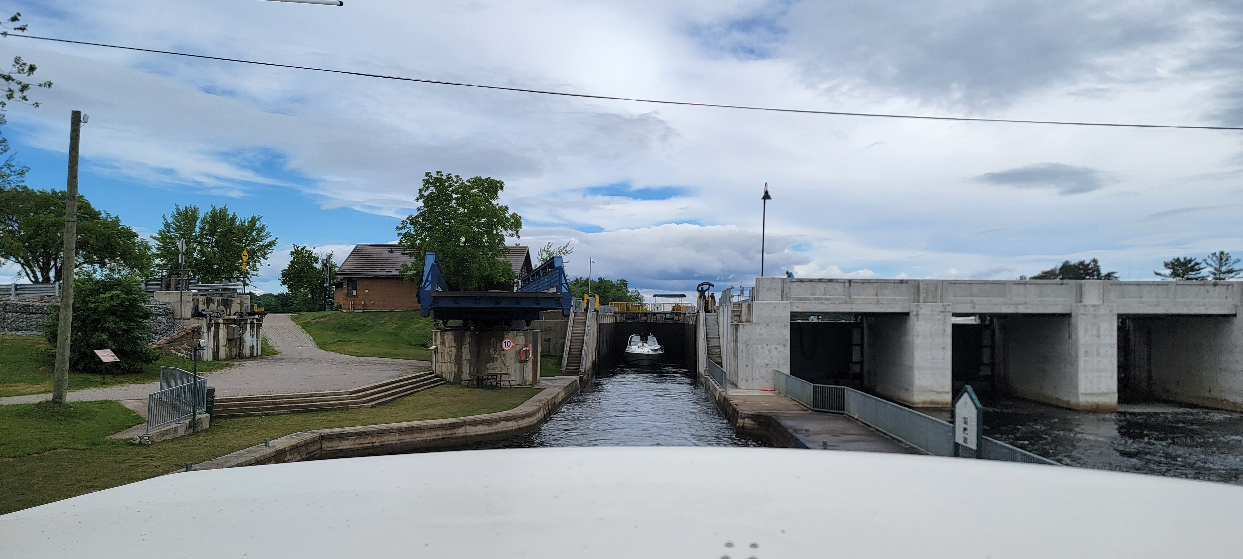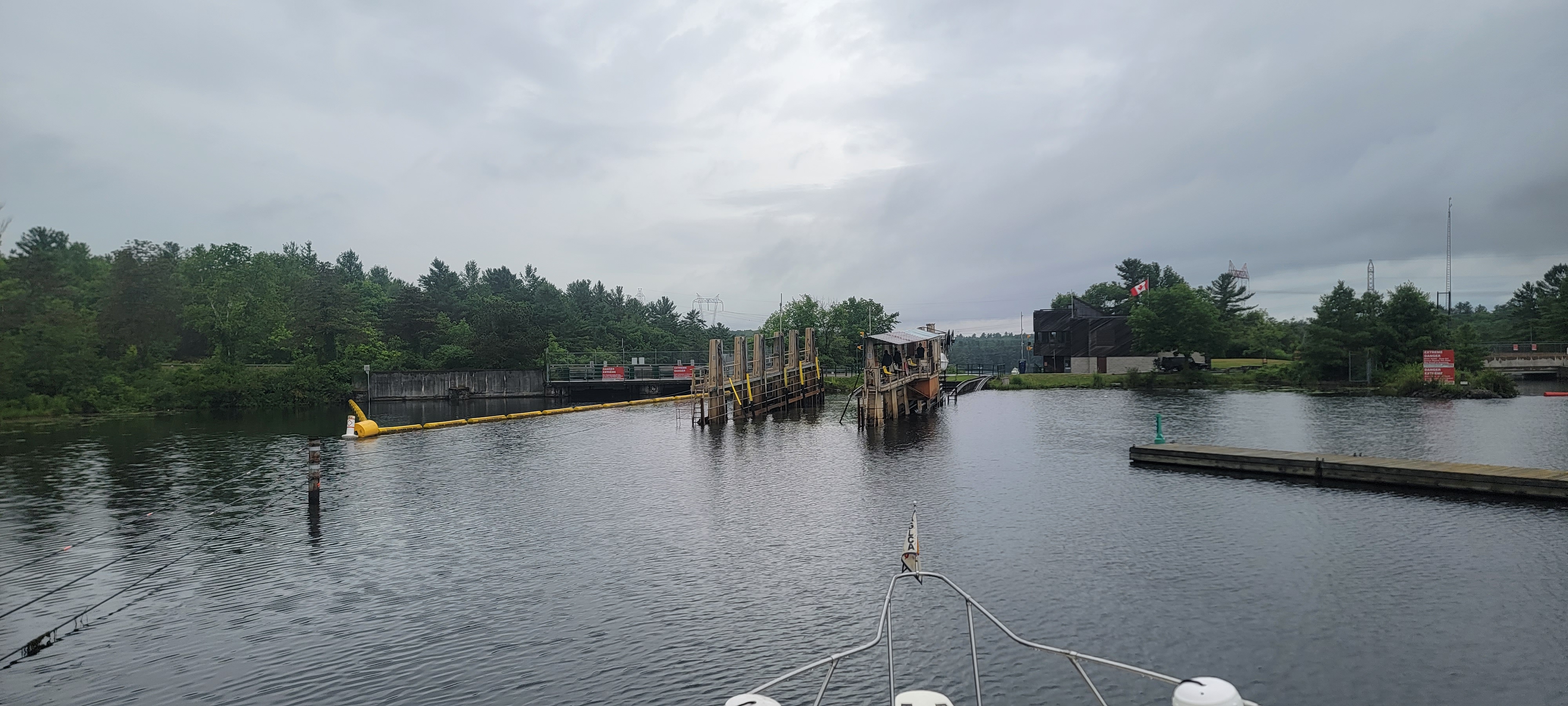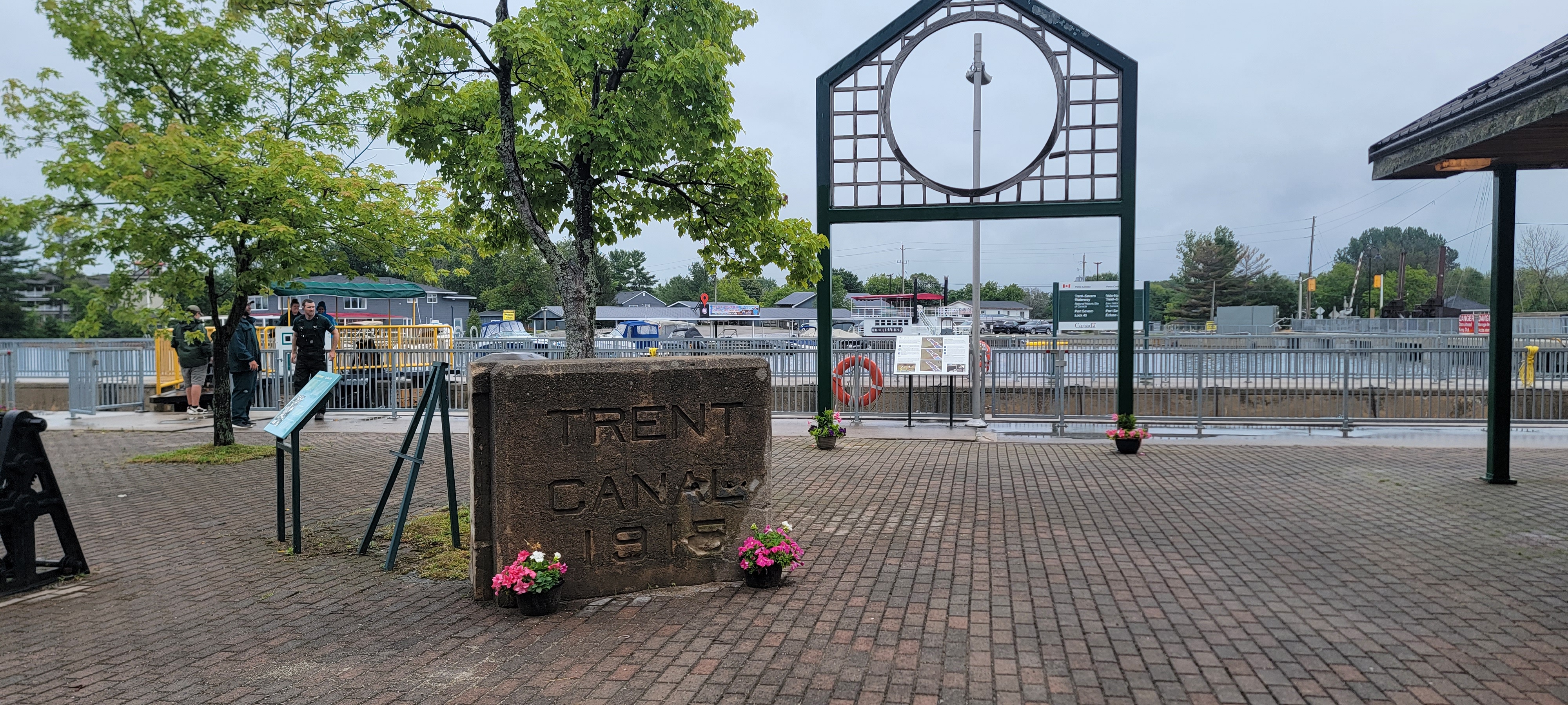 From there we had a short 8.5 mile run through some beautiful cottage country to the next lock. Lock 45, Port Severn lock, was to be our 108th and final lock of our Loop. Perhaps savoring the moment, and because I needed to get some work done, we tied up at the top side of the lock at the grey dock for several hours. I worked as Wendy greeted fellow loopers going through the lock and took their pictures for them.