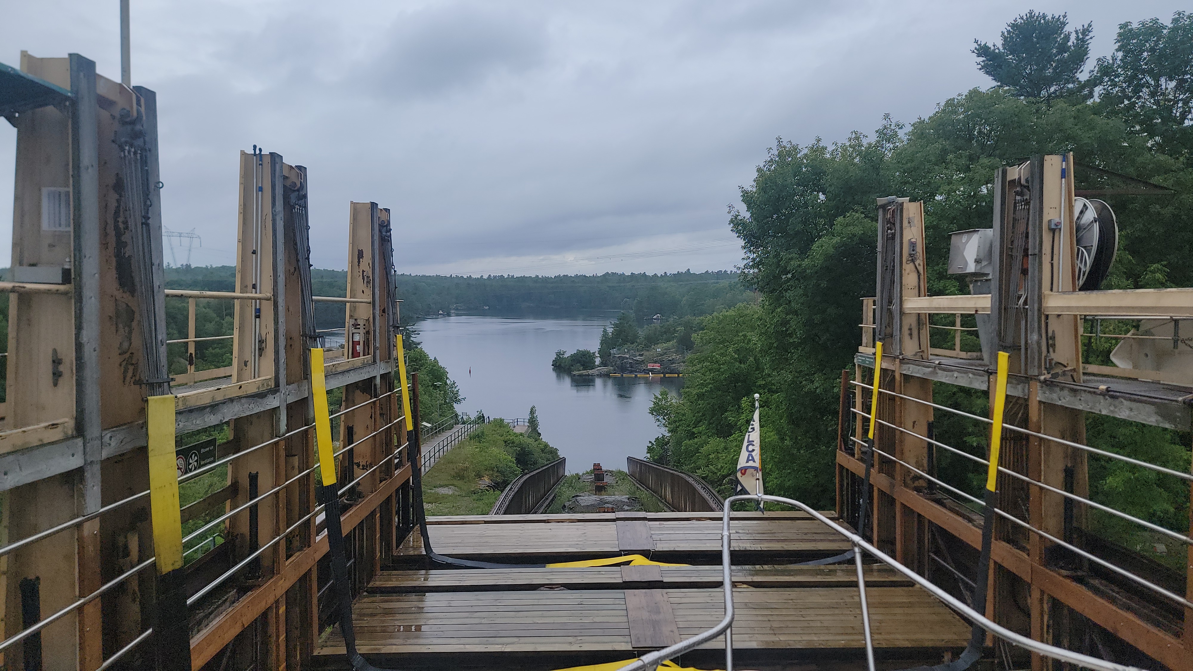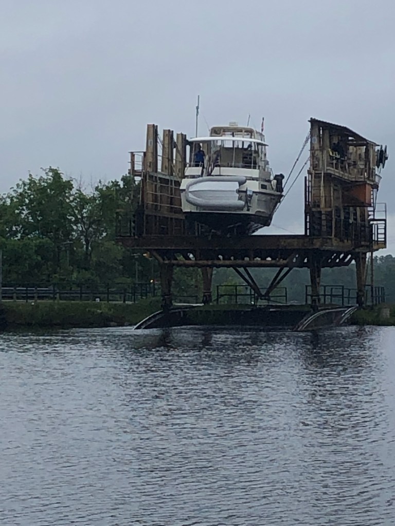 That complete, Wendy and I stood on our boat with video running as we were lifted out of the water, moved over the hill, and moved back down the other side of the hill. The whole process took less than 10 minutes. On the way down, there was a loud clank and a shudder. Thankfully, I remembered that happening as we were watching the train operate the day before and knew it was normal. We learned later that that was the cables reversing direction to manage the weight.