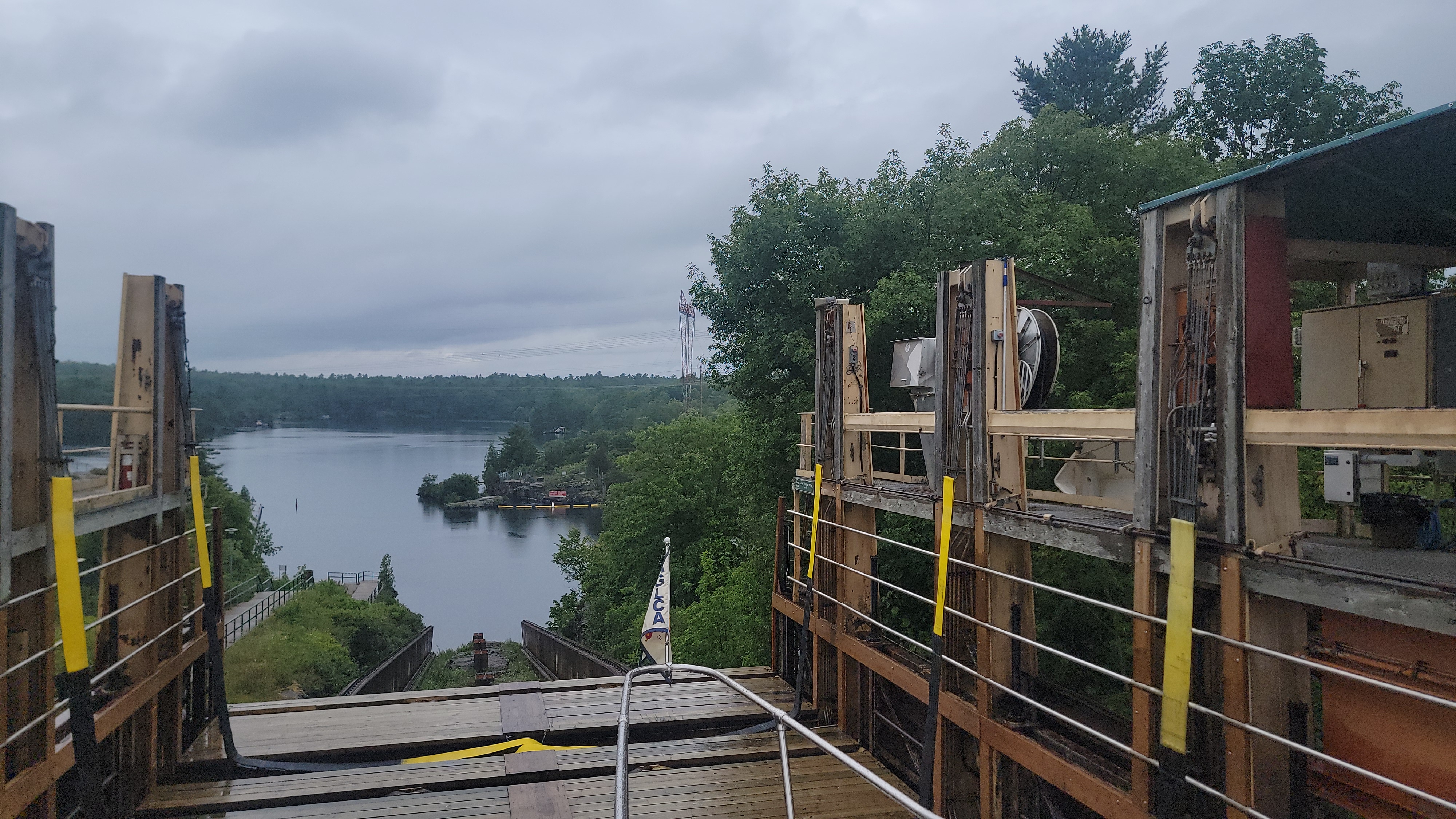 Morning came and it was our turn to go through the Big Chute. It didn’t open until 9 AM, so we had a leisurely morning waiting. At about 8:30 AM, it started to rain. It wasn’t a hard rain, but just enough to make it worth putting on the rain gear. At almost exactly 9 AM, we saw the big carriage start moving toward the water and heard the bells as the gates closed the road. Here we go!