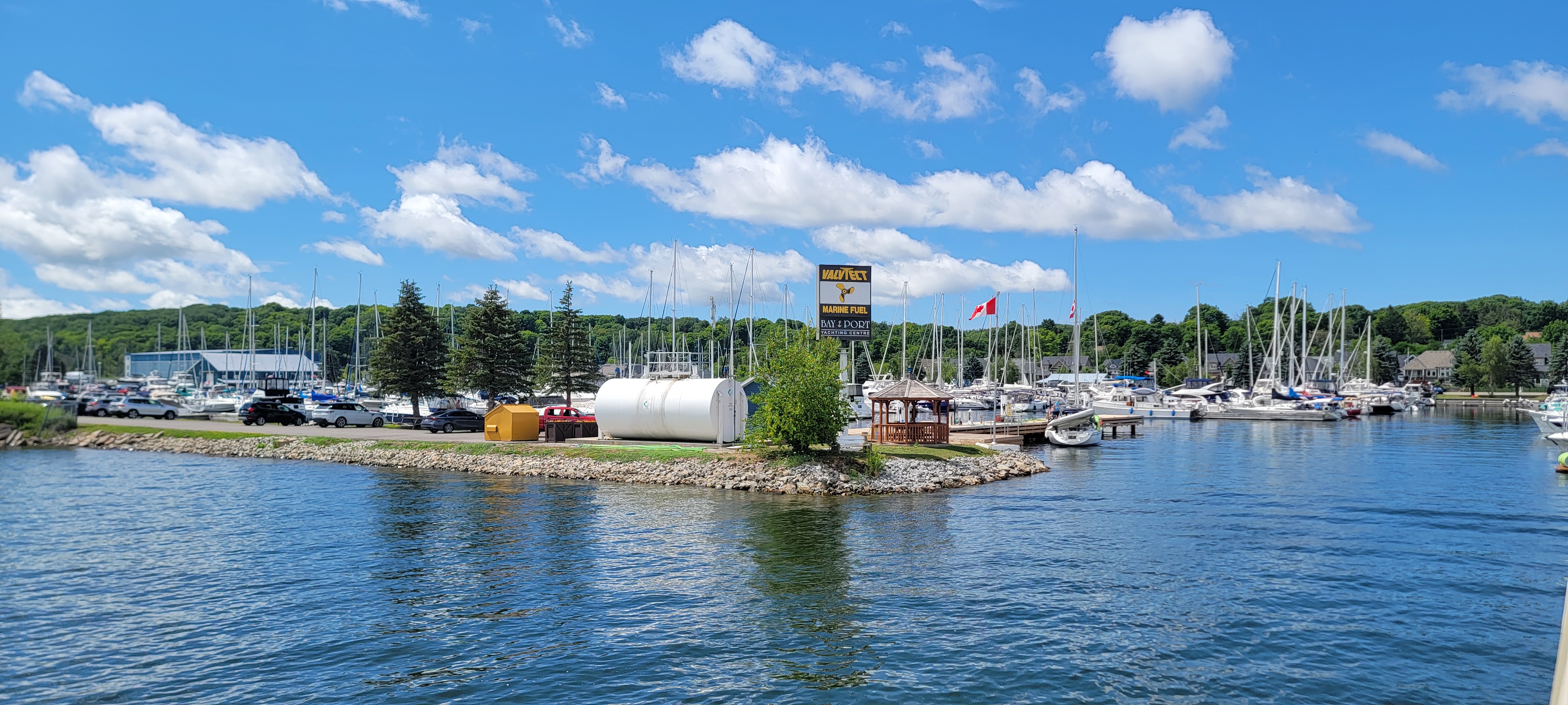 We had booked a slip at the Bay Port Yachting Center just outside of Midland proper. The town marina is usually preferred because of its easy access to downtown and stores, but due to a tall ship regatta the next weekend, there wasn’t room for us. Bay Port is a beautiful marina with excellent facilities. We stopped at the fuel dock at the entrance for fuel and a pump out before making our way into slip M1. It’s a great spot very near all of the marina facilities.