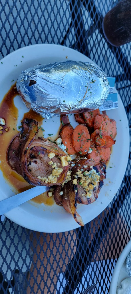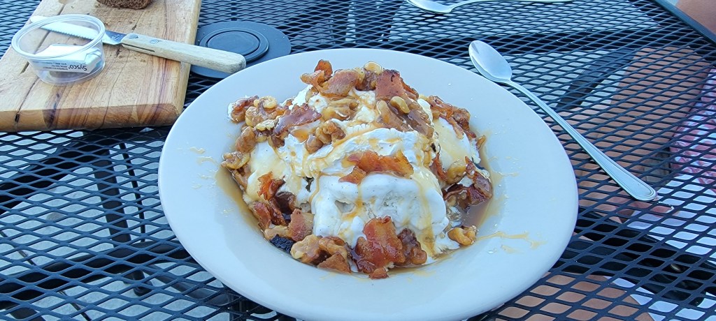 We had a very nice dinner at Circle M. It was a little chilly at our outdoor table, but the meal was wonderful. The entrees were both great, but the gingered carrots that were served on the side were amazing! I loved them so much! I had a “Stowaway,” which was champagne, Beefeater Gin, Fresh Lemon, and Simple Syrup. It was one of the better cocktails I’ve had lately. Owen’s dessert was a Sweet and Salty Sundae, which included ice cream, caramel, candied walnuts, and bacon. It was crazy good!