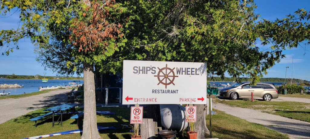 Kap’s is a small marina, but it would be just fine. We had power at our slip, but no water. There were clean bathrooms, and there was a restaurant on site. We went to the restaurant, The Ship’s Wheel, for a fantastic grouper fish fry, with cherry pie included! As we were finally back in Wisconsin, I eagerly ordered my old standby: a brandy old fashioned sweet with cherries. Unfortunately, the restaurant can only sell beer and wine, so I settled for a beer. I’ll have to wait until our next stop for a Wisconsin old fashioned!